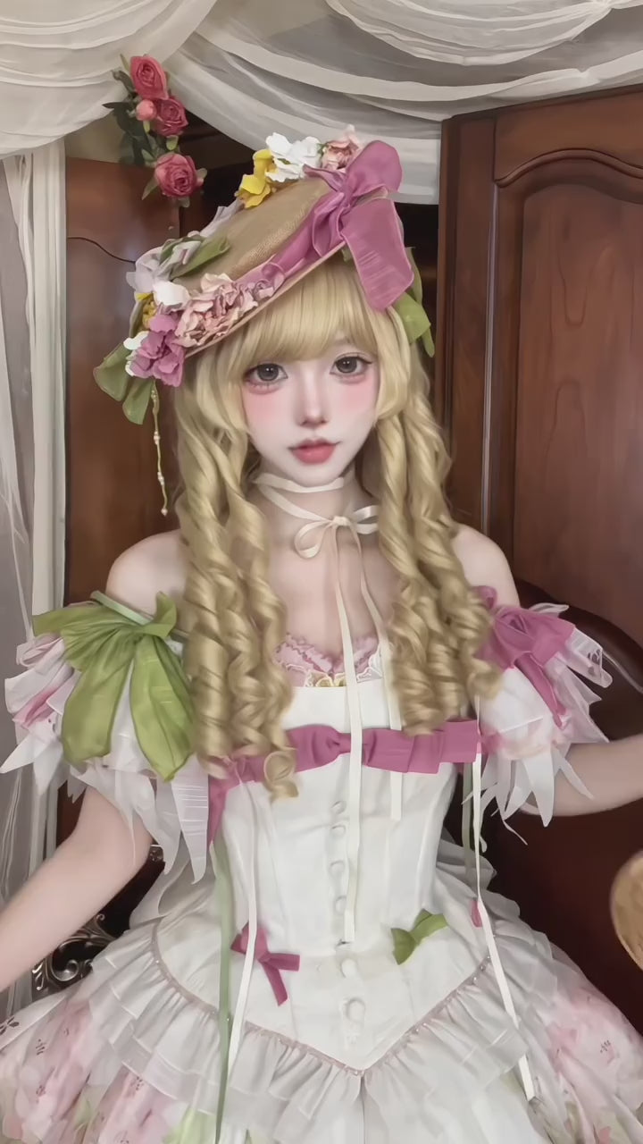 – Design Details: This JSK features a beautifully structured bodice accented with delicate ribbon detailing and soft sheer sleeves that create an ethereal, fairy-like silhouette. The skirt flows into a full, bell-shaped design adorned with a romantic floral print, layered ruffles, and gentle pleating that enhance its doll-like charm. Subtle bows and pastel accents add depth and sweetness, while coordinating accessories complete the look with refined storybook elegance.