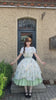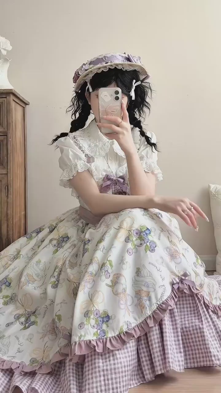 * Lavender Picnic (Lavender): Features a floral overskirt in soft lavender hues layered over a lilac gingham underskirt. The lavender waist sash ties into a large bow at the back, creating a sweet, elegant silhouette inspired by blooming gardens and afternoon tea gatherings. Comes with the matching white blouse, completing the look with gentle contrast and charm.