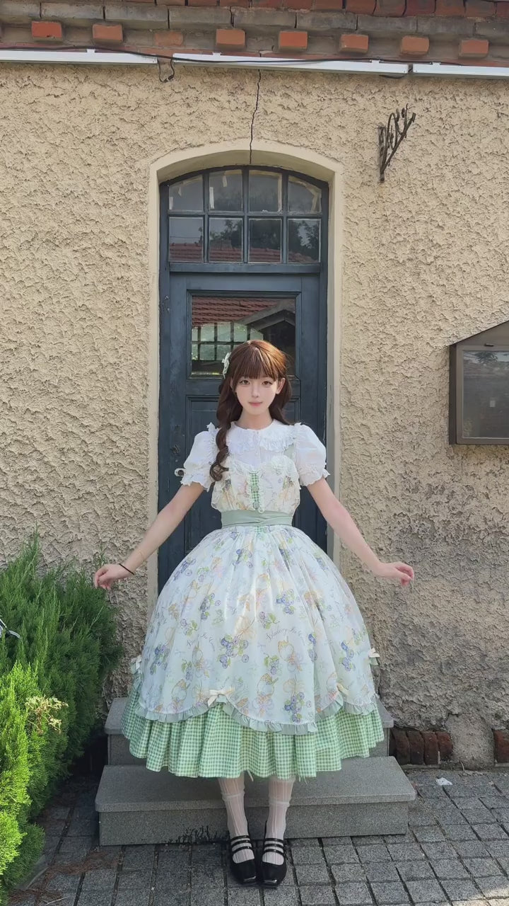 * Mint Picnic (Mint): Showcases a refreshing mint-green gingham underskirt paired with a floral-print overskirt in white and pastel tones. A mint waist sash and matching bows add a touch of freshness, evoking the soft breeze of a spring morning. Also includes the same white blouse, creating a refined and harmonious coordination with the mint colorway.