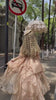 The voluminous high-low skirt blooms with cascading ruffles of organza and satin, each layer trimmed with golden lace that catches the light with every movement. Pearled accents, floral appliqués, and carefully placed bows add richness and refinement to the design, embodying the essence of baroque elegance.