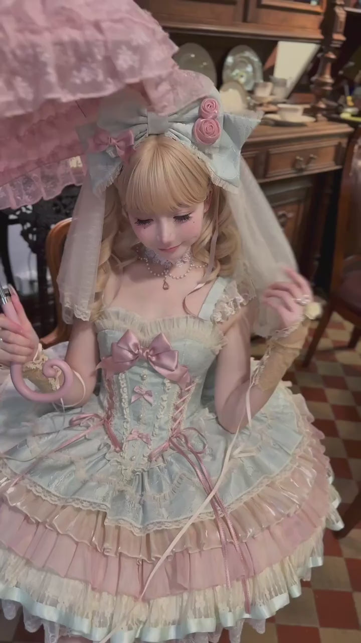 – Design Details: This exquisite JSK features a structured corset bodice adorned with intricate lace trim, pearly accents, and elegant crisscross ribbon lacing that enhances the feminine silhouette. The base color is a soft mint blue, beautifully contrasted with blush pink and ivory ruffled tiers that create a voluminous, layered skirt reminiscent of Rococo court gowns. A satin bow in pastel pink decorates the bust, while delicate lace and ribbon details accentuate the bodice and hem. The ensemble is completed with a grand mint blue headdress embellished with pink ribbon roses and a sheer lace veil, evoking a sense of vintage grandeur and fairytale refinement.