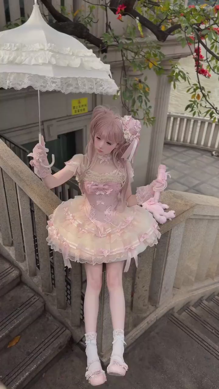 – Design Details: This JSK showcases a delicately structured corset-style bodice with lace-up ribbon detailing, satin bows, and ornate lace trims that enhance its doll-like silhouette. The skirt blooms into a short, voluminous bell shape, layered with cascading ruffles, lace embroidery, and ribbon accents for a richly textured finish. Sweet bow details adorn the skirt, adding depth and playful charm. The design embodies a soft, dessert-inspired aesthetic perfect for sweet Lolita styling.