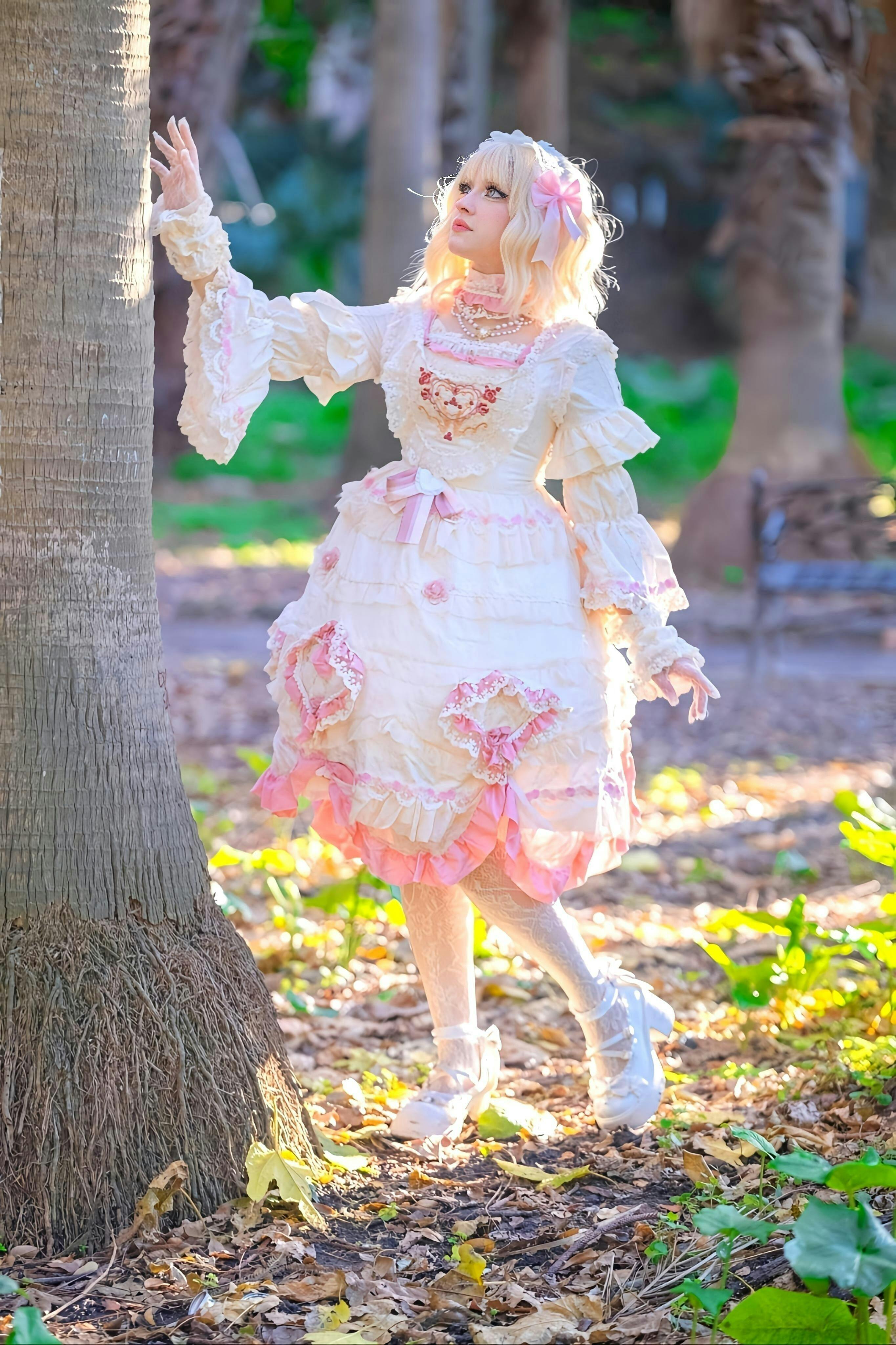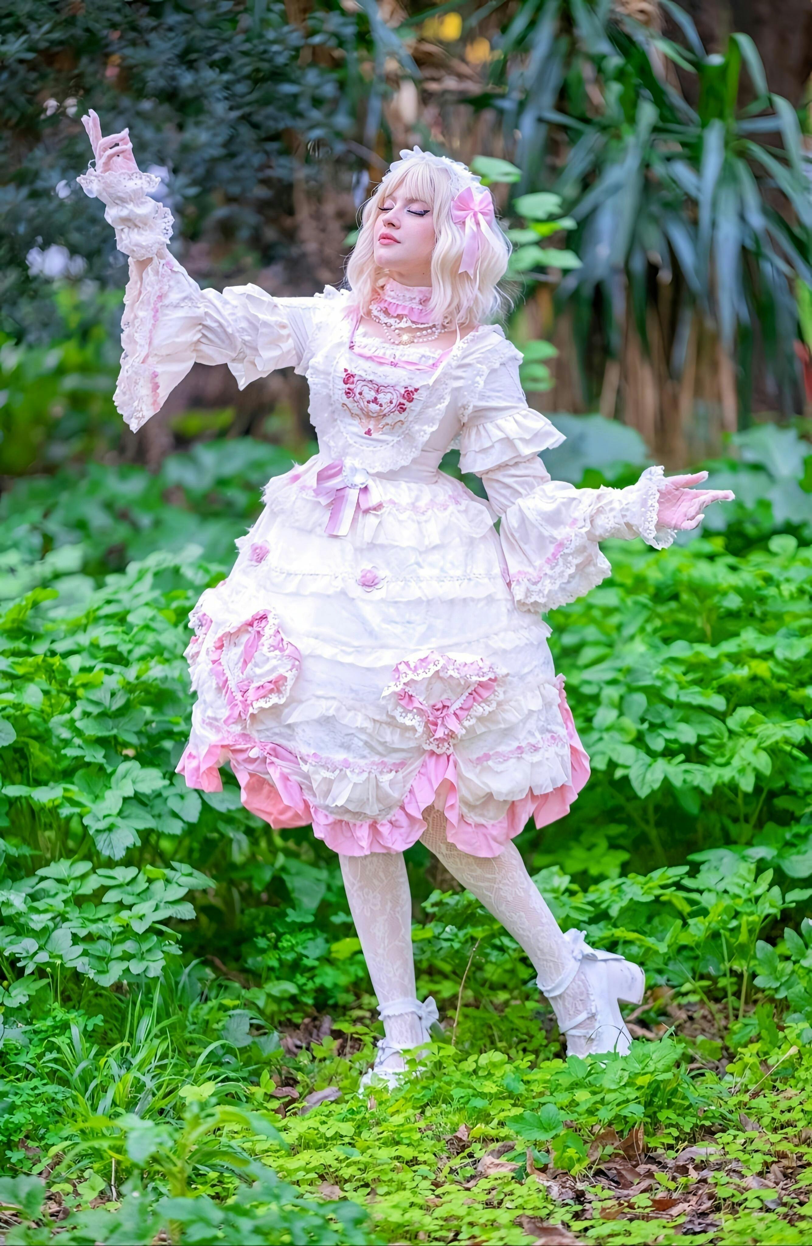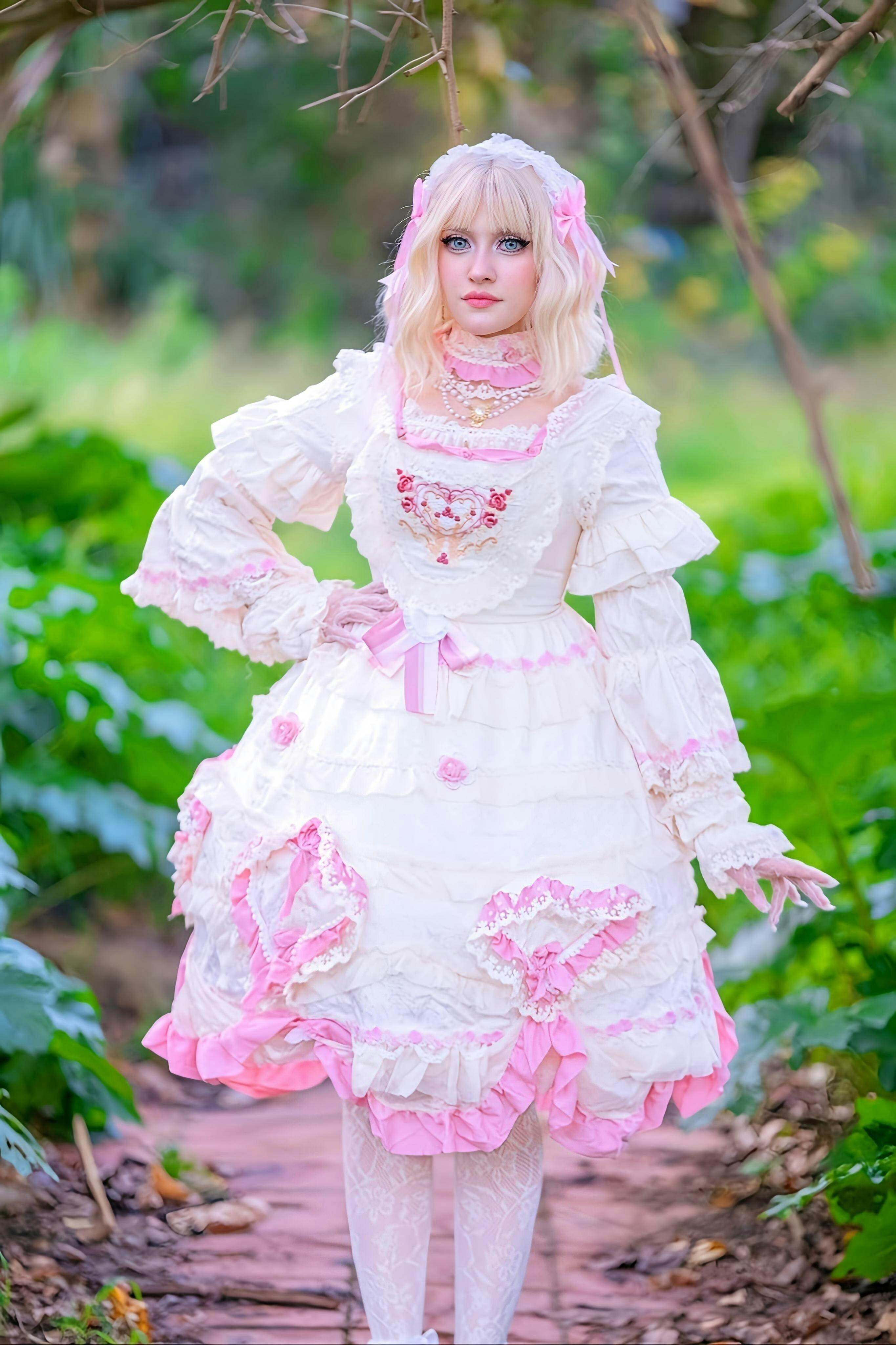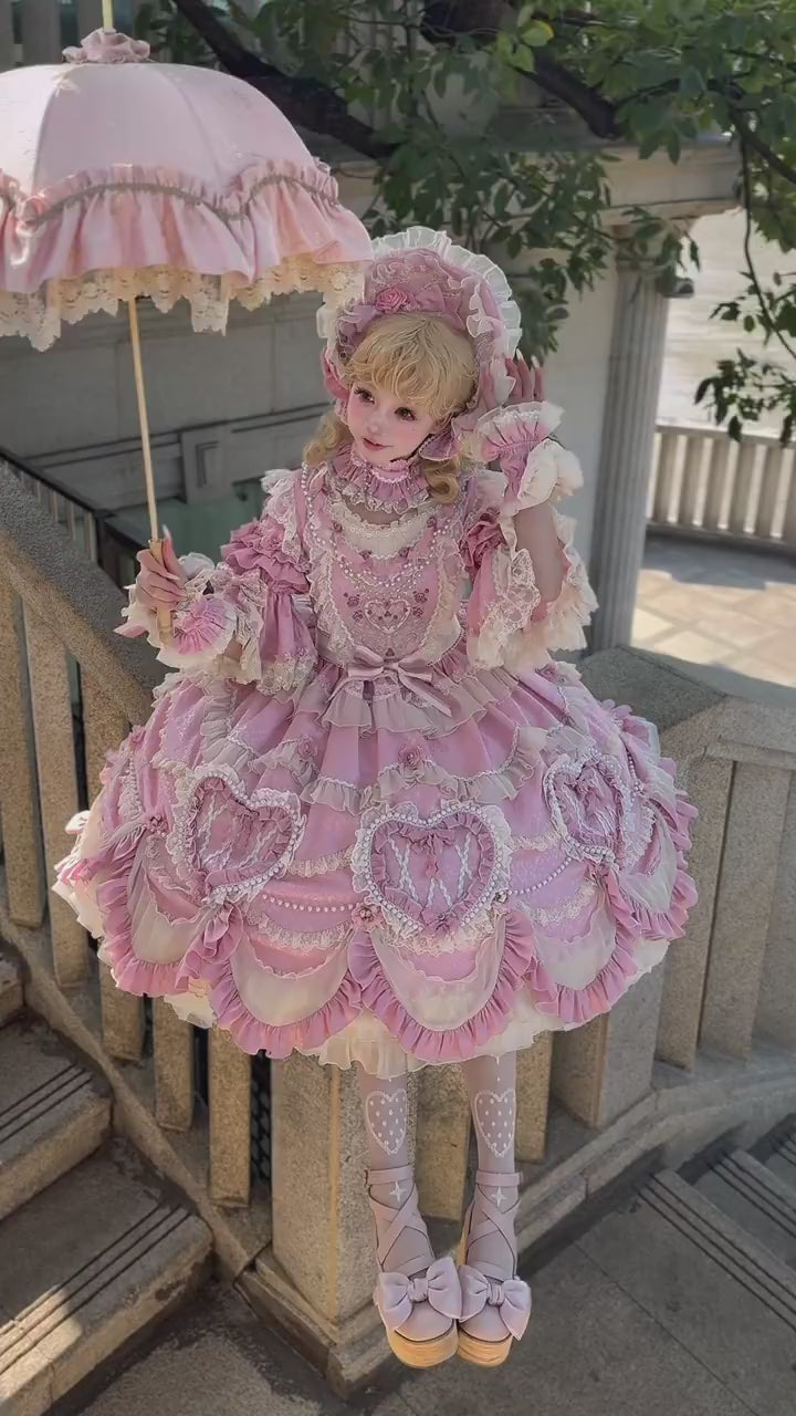 Design Details: This enchanting one-piece dress features a soft baby pink base adorned with cascading tiers of ruffled lace and heart-shaped appliqués embellished with pearls and floral embroidery. The high lace neckline and puffed sleeves trimmed with layered frills create an aristocratic silhouette reminiscent of Rococo ball gowns. The bodice is detailed with a delicate embroidered heart motif and shimmering beads, while satin ribbons and floral trims accentuate the waist and skirt layers for a confectionary elegance. The voluminous skirt blooms with intricate lace panels and ruffled underskirts that enhance the full silhouette, making it perfect for petticoats. The back features adjustable corset lacing for a refined, tailored fit, while detachable bows add versatility to your styling.