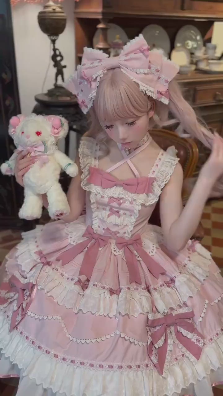 – Design Details: This OP features a beautifully structured bodice adorned with layered lace panels, delicate ribbon bows, and refined trims that enhance its classic doll-like silhouette. The neckline is accented with soft frills and elegant detailing, while the skirt blossoms into a full, bell-shaped volume with cascading ruffles and lace edging. Subtle bow accents throughout the skirt add depth and sweetness, creating a harmonious and romantic overall design.