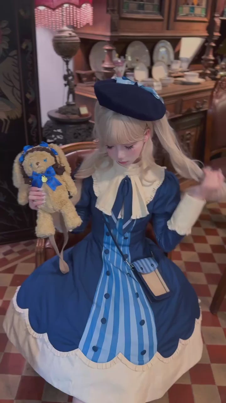 This exquisite one-piece dress features a high-neck cream collar with ruffled trim and a large bow tie, evoking the sophistication of antique school uniforms. The bodice showcases alternating deep navy and pastel blue stripes, adorned with covered buttons that enhance its tailored silhouette. The scalloped hemline framed with ivory ruffles and the puffed long sleeves with cream cuffs bring a nostalgic touch, balancing formality and sweetness. Completing the ensemble is a matching beret and detachable crossbody bag in coordinated blue tones, creating a perfectly cohesive and refined look.