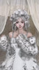 This delicate JSK showcases a beautifully structured bodice adorned with ribbon lace-up detailing and plush faux-fur trim. The skirt blooms into airy layers of ivory fabric, finished with soft gray speckled fur accents that recall freshly fallen snow. Subtle satin ribbons and refined lace edging enhance the doll-like charm, while the matching fur headpiece and detachable elements complete the look with a whimsical, storybook finish.