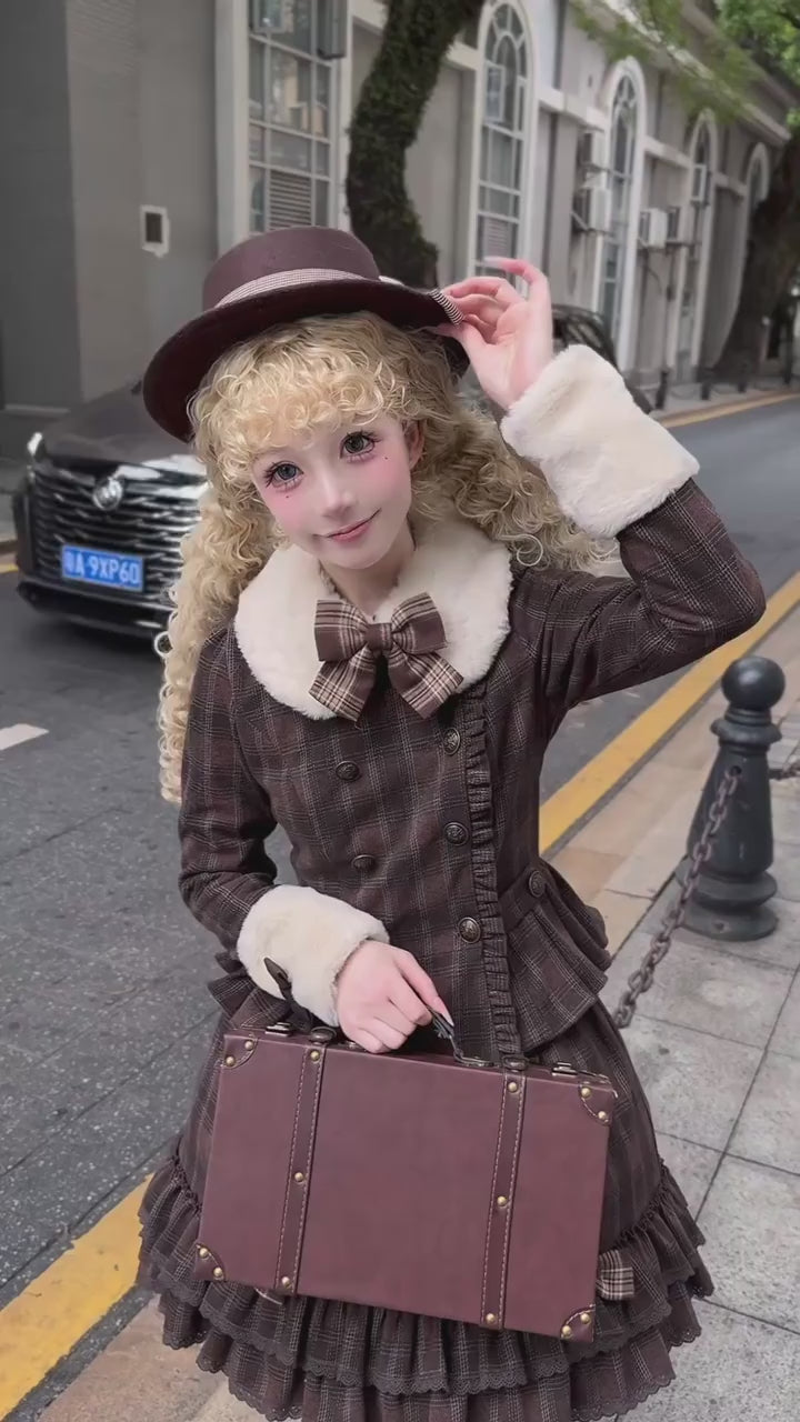 — Design Details: This enchanting two-piece set features a rich brown plaid wool-blend fabric accented with delicate ruffles and structured pleating. The jacket’s luxurious cream faux-fur collar and cuffs add a plush, wintery charm, complemented by matching plaid bows that bring cohesion and softness to the silhouette. Decorative buttons and tiered skirt layers echo the craftsmanship of antique doll attire. The look is completed with thoughtful accessories such as ribbon-trimmed hats, dainty parasols, and plush toy motifs — enhancing its whimsical, storybook appeal.