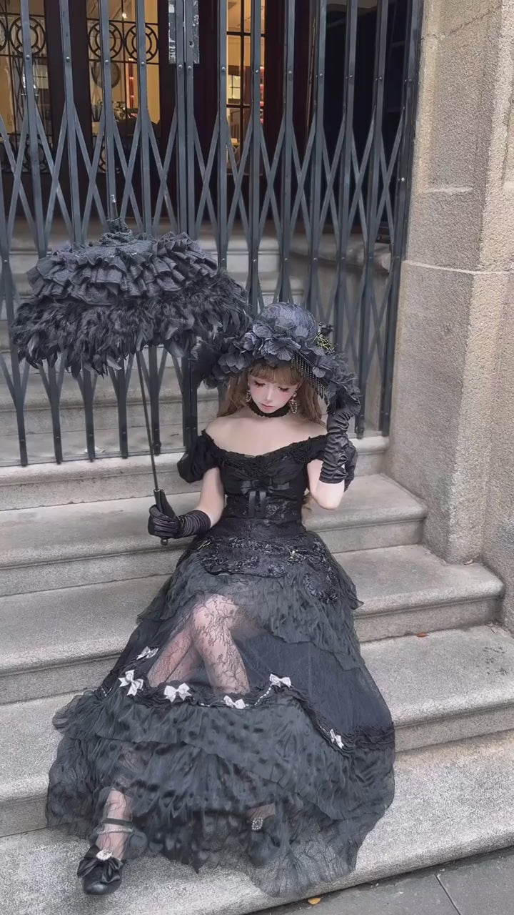 This ethereal gown features a sculpted off-shoulder bodice adorned with layered lace, hand-sewn beaded motifs, and a satin bow centerpiece, evoking the refined decadence of vintage mourning attire. The skirt cascades in tiered ruffles of delicate mesh and embroidered lace, forming a graceful high-low silhouette that reveals subtle lace paneling beneath. Small contrasting bows and ornate chain accents elevate the dress with a touch of aristocratic charm. Every element — from gathered puff sleeves to textured floral appliqué — enhances its dramatic, antique-inspired beauty.