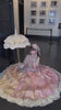 This majestic corset-style gown features a delicately structured bodice adorned with blush-pink pleated satin, pearl drapery, and jeweled brooches that shimmer like antique heirlooms. Soft lace sleeves gently fall off the shoulders, evoking classical femininity, while cascading satin bows and rose appliqués bloom across the bodice and skirt. The voluminous multi-layered skirt shimmers in tones of blush champagne and antique rose, catching the light with an iridescent sheen. Each petal-shaped overlay flows gracefully over the underlayer of soft gold fabric, framed by scalloped lace and pearl trim that add a divine finishing touch.