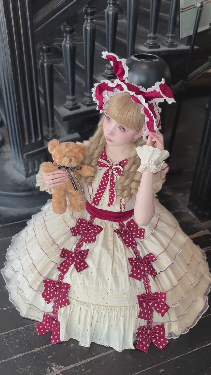 Step into a dreamy fairytale with our Vintage Cream & Burgundy Polka Dot Lolita Dress, designed to make every moment magical. This classic Sweet Lolita dress features a flattering A-line silhouette with layers of soft cream ruffles, trimmed delicately with burgundy lace and adorned with sweet polka dot bows. Perfect for tea parties, cosplay, or your everyday kawaii fantasy.