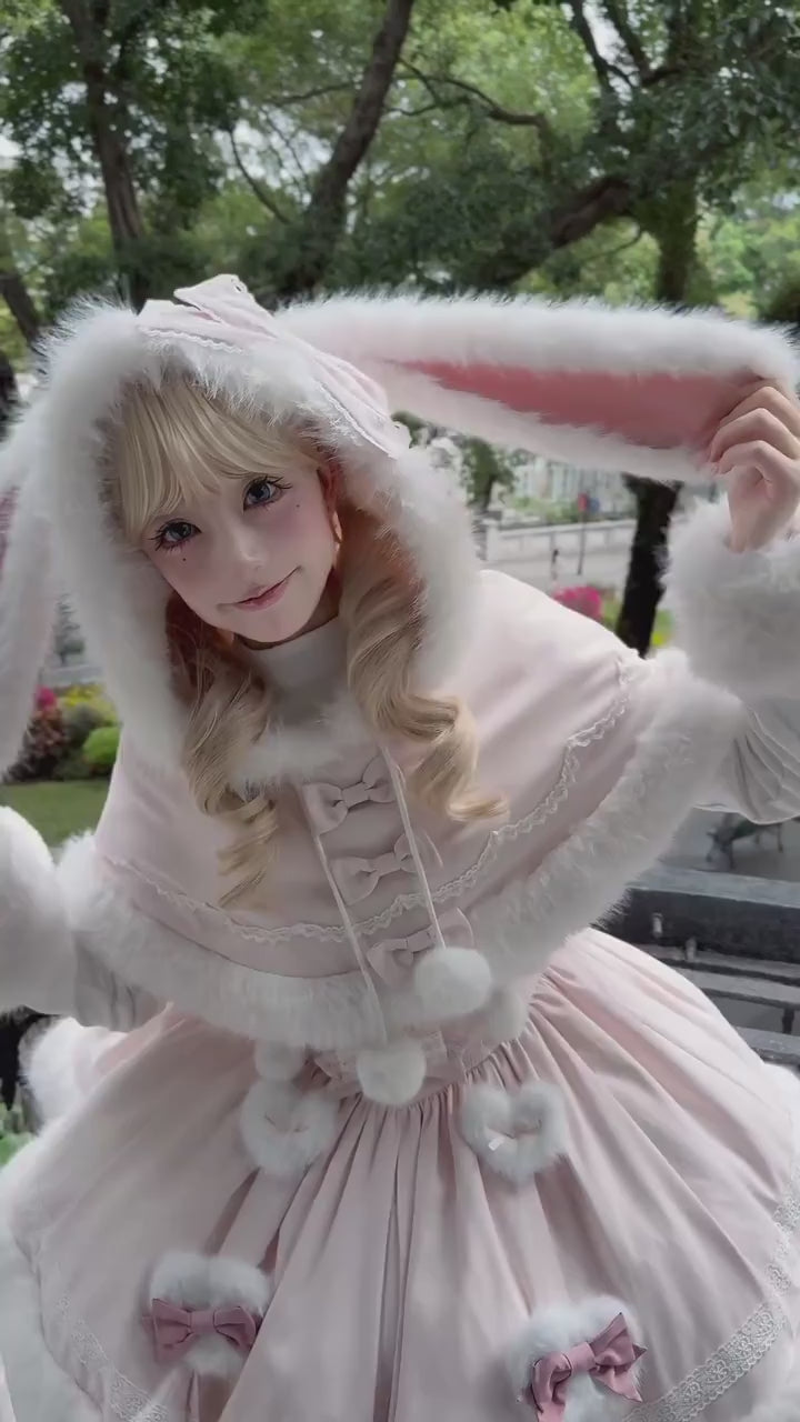 — Design Details: This magical ensemble features a delicate soft pink fabric adorned with plush white faux-fur trim, creating a cozy yet ethereal winter silhouette. The bodice is decorated with crisscross ribbon lacing, lace accents, and fluffy pom-poms that sway with movement. The detachable hood — complete with oversized bunny ears and a velvet bow — adds irresistible charm and transforms the look into a fantasy woodland moment. The voluminous skirt is sprinkled with faux-fur rosettes and pastel bows, giving it a confection-like appearance reminiscent of powdered sugar and snow petals.